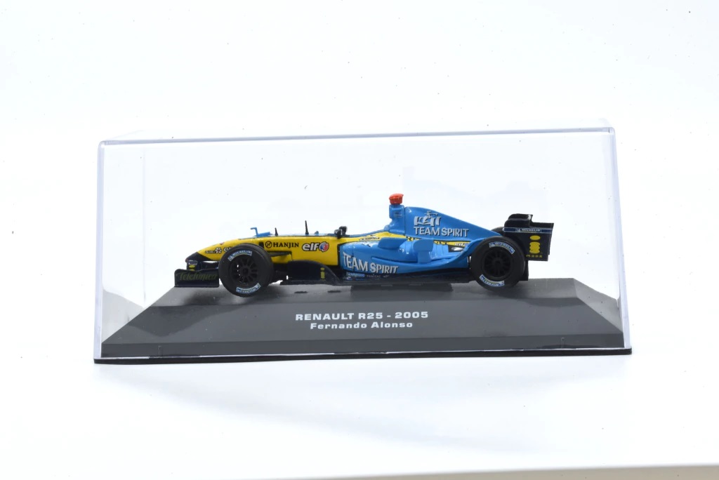 A miniatura do Renault R25 de 2005, pilotado por Fernando Alonso, é uma verdadeira joia para os fãs de Fórmula 1 e colecionadores. Com escala 1:43, essa peça exibe com precisão o carro que levou o espanhol ao bicampeonato mundial, marcando uma das temporadas mais memoráveis da história da F1.
